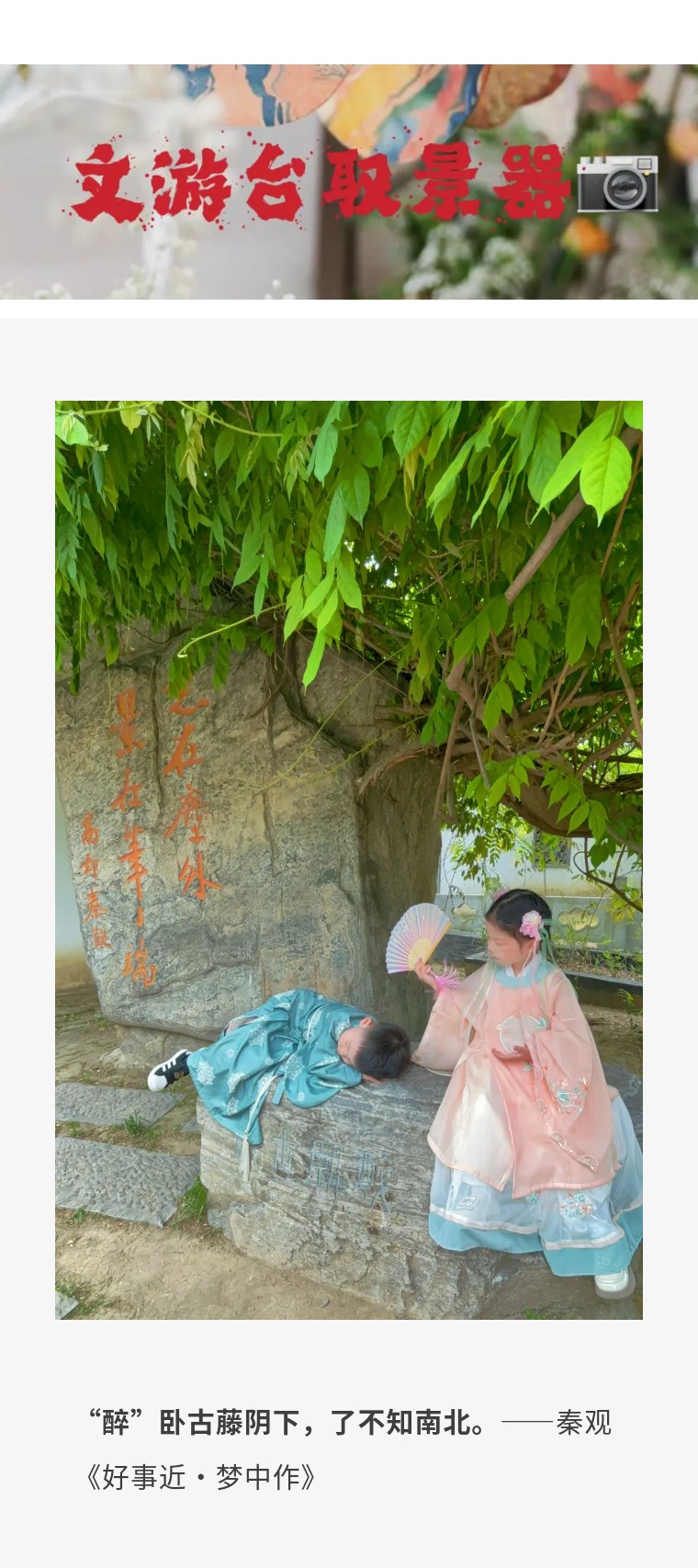宋词滤镜下的文游台像是一幅淡薄宁静的水墨画,微风轻拂,树叶轻声摇曳,似乎也得了秦观词里的款款深情。
