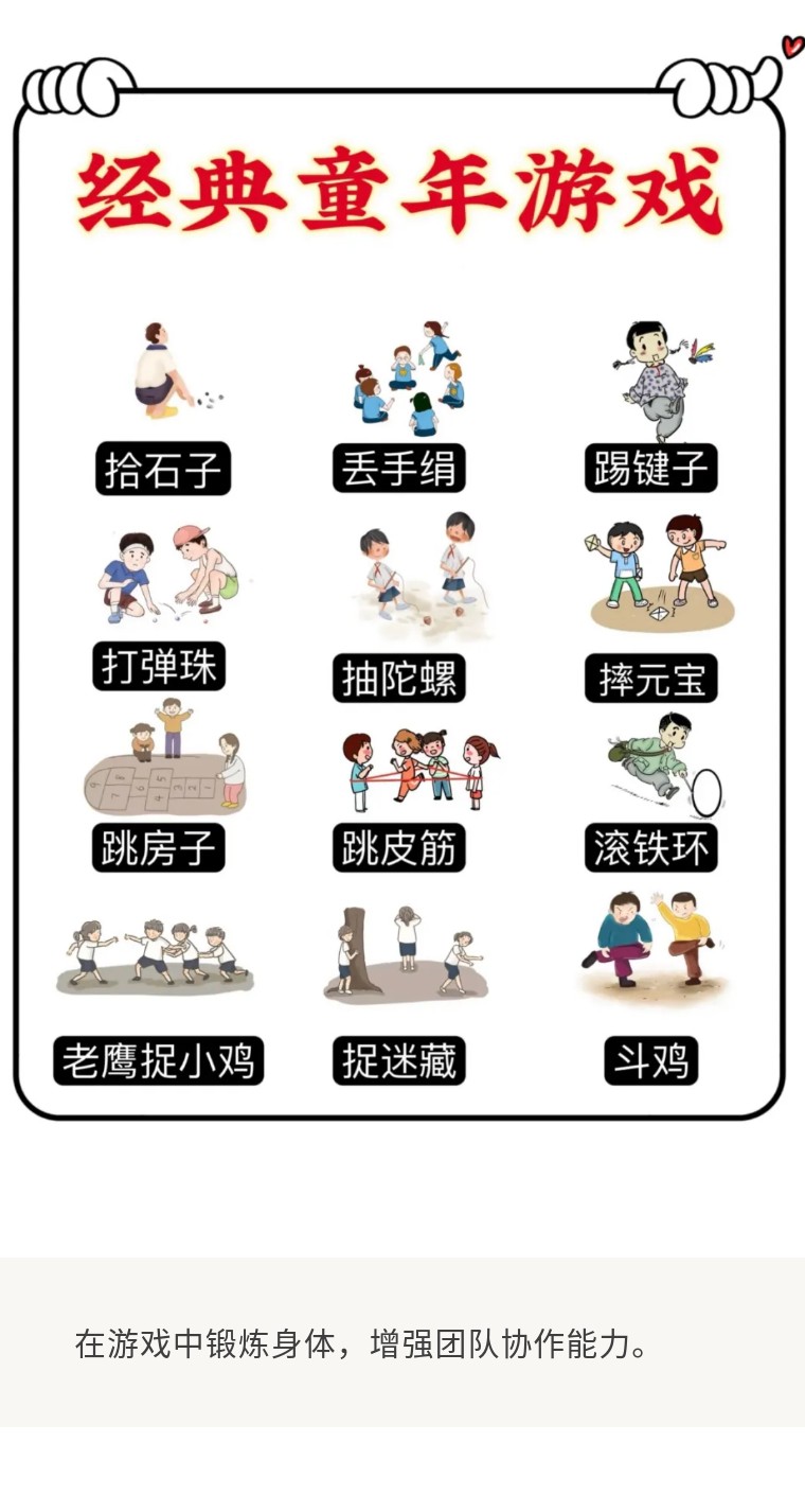 开展滚铁环、跳房子、丢沙包等怀旧游戏,重温童年记忆。