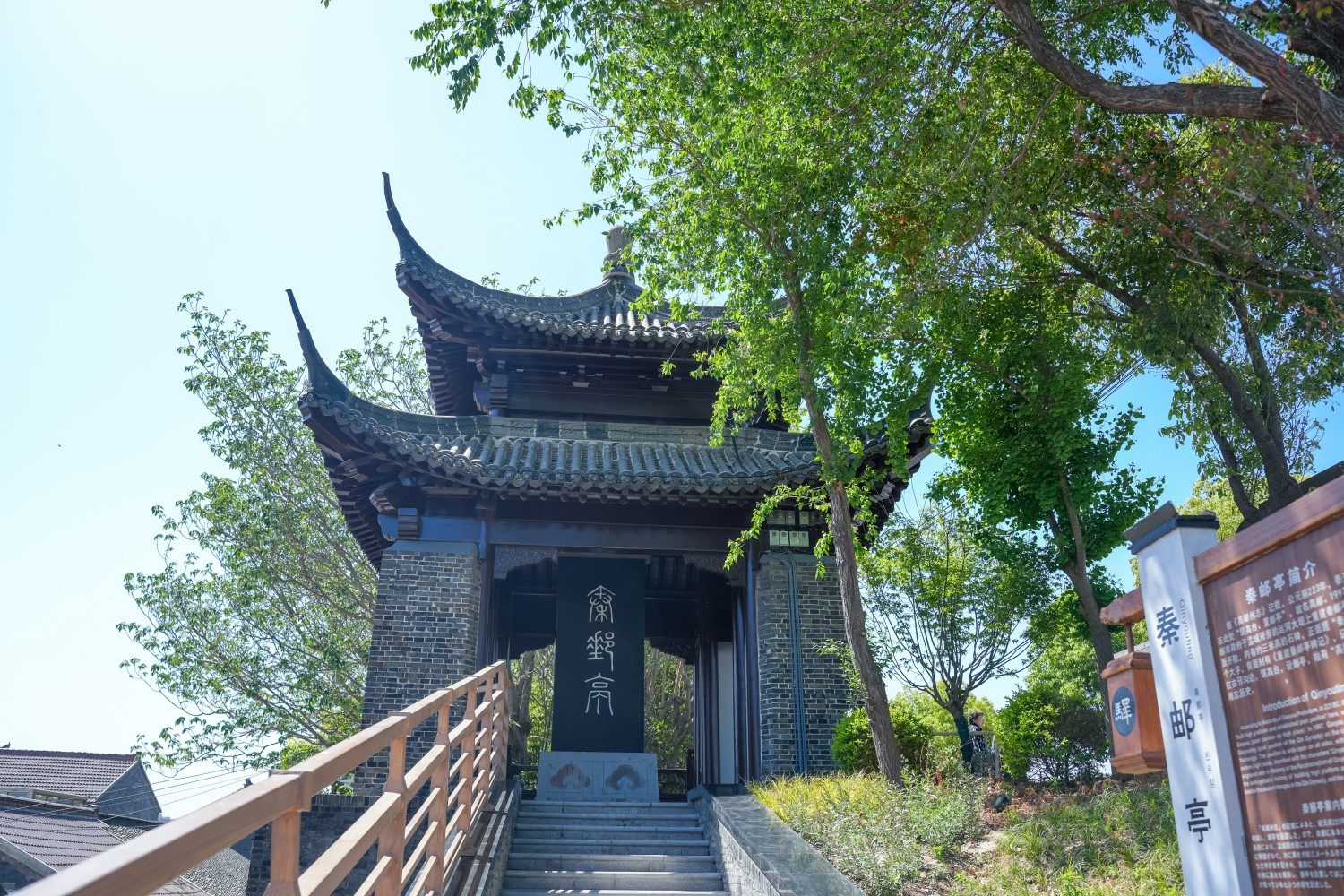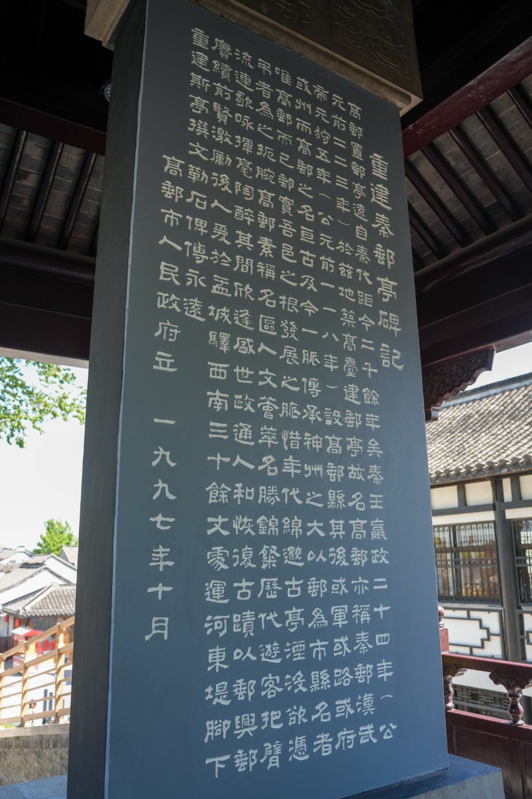 据《高邮州志》记载,公元前223年,秦王嬴政在此处“筑高台、置邮亭”, 故名高邮,亦称秦邮。邮亭既是传达政令、管理邮驿通信事务的机构,又是地方小的行政单位,十里一长亭,设有亭长,掌管征税赋役、缉捕盗贼相关事务,同时又是行旅馆舍。秦邮亭的建立带来了高邮2000多年的发展与繁荣,有极高的历史研究价值。1997年,高邮市政府于盂城驿旁的运河大堤上重建秦邮亭,粉墙黛瓦、重檐翘角,它每角有石柱3根,共12根。亭四面开敞,内有约三米高的石碑,正面题“秦邮亭”三个大字,背面刻有“重建秦邮亭碑记”, 秦邮亭的碑碣上阴文镌刻着我市朱延庆先生记叙了秦王(嬴政)在古邗沟边,设立邮亭的这段难忘历史。